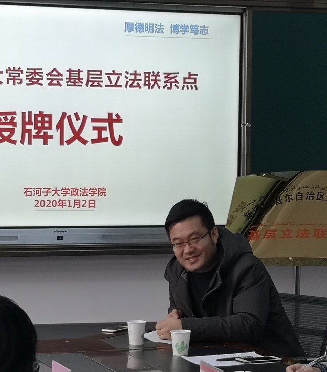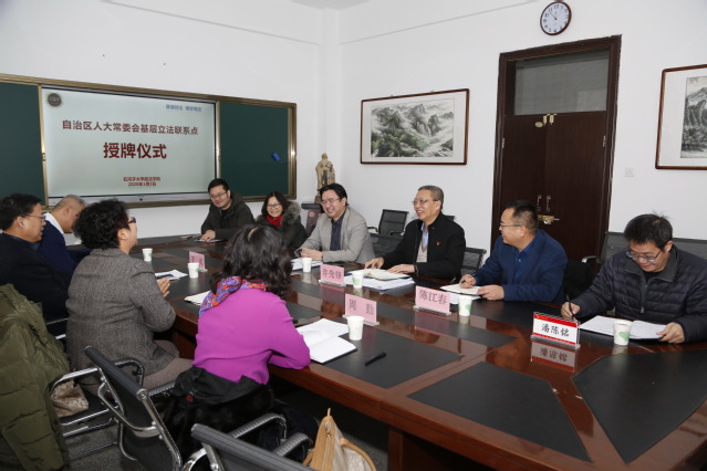 2020年1月2日上午,自治区人大常委会基层立法联系点授牌仪式在williamhill在线体育二楼会议室举行。授牌仪式由williamhill在线体育院长湛中乐主持。自治区人大常委会法制工作委员会主任李娟,石河子大学党委副书记、纪委书记许先锋出席仪式并致辞,自治区人大常委会法制工作委员会干部周勤、石河子大学科研处副处长陈江春、石河子市人大常委会副主任王武、石河子市人大常委会干部张东和williamhill在线体育法律系部分教师参加了授牌仪式。