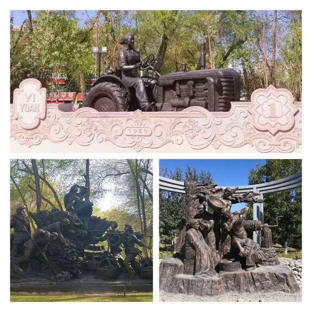随后,大家近距离瞻仰了以我国第三套人民币1元纸币正面人物为原型的《女拖拉机手》雕塑、展现兵团第一代女战士进行屯垦戍边劳动场景的《三八红旗手》雕塑、记录第一代军垦人艰辛劳动后归来仍意气风发的《劳动归来》雕塑。