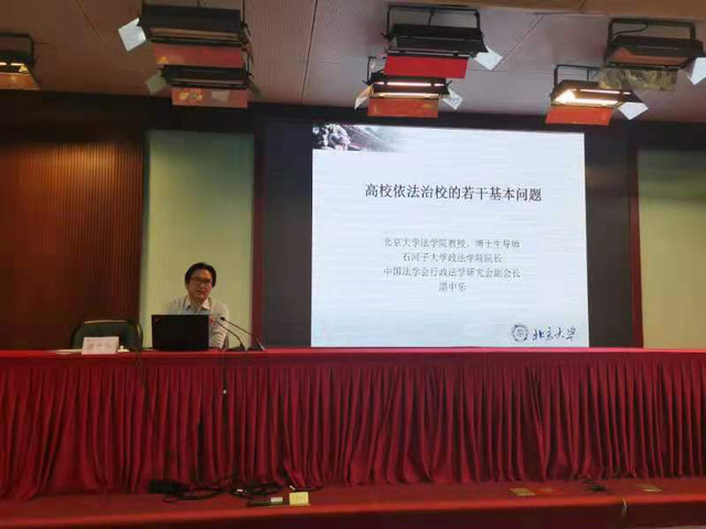 湛中乐教授的专题报告:《高校依法治校的若干基本问题》。讲座内容包括四个方面:一、法治中国背景下的依法治校与依法治教;二、高校依法治校的重要主体:中国特色大学治理结构;三、高校依法治校的重要目标:依法保障师生的主体地位;四、高校依法治校的法律后果:高校教育行政诉讼。最后,湛教授还结合若干教育行政诉讼典型案例,分析了教育行政诉讼的若干特点以及学校参与教育行政诉讼应当特别注意的若干问题。