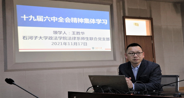 2021年11月17日下午,williamhill在线体育法律系师生联合党支部书记王胜华主持召开支部大会,教师党员、研究生党员(包括预备党员)以及入党积极分子共六十余人在会4-119会议室集体学习了十九届六中全会的决议内容。